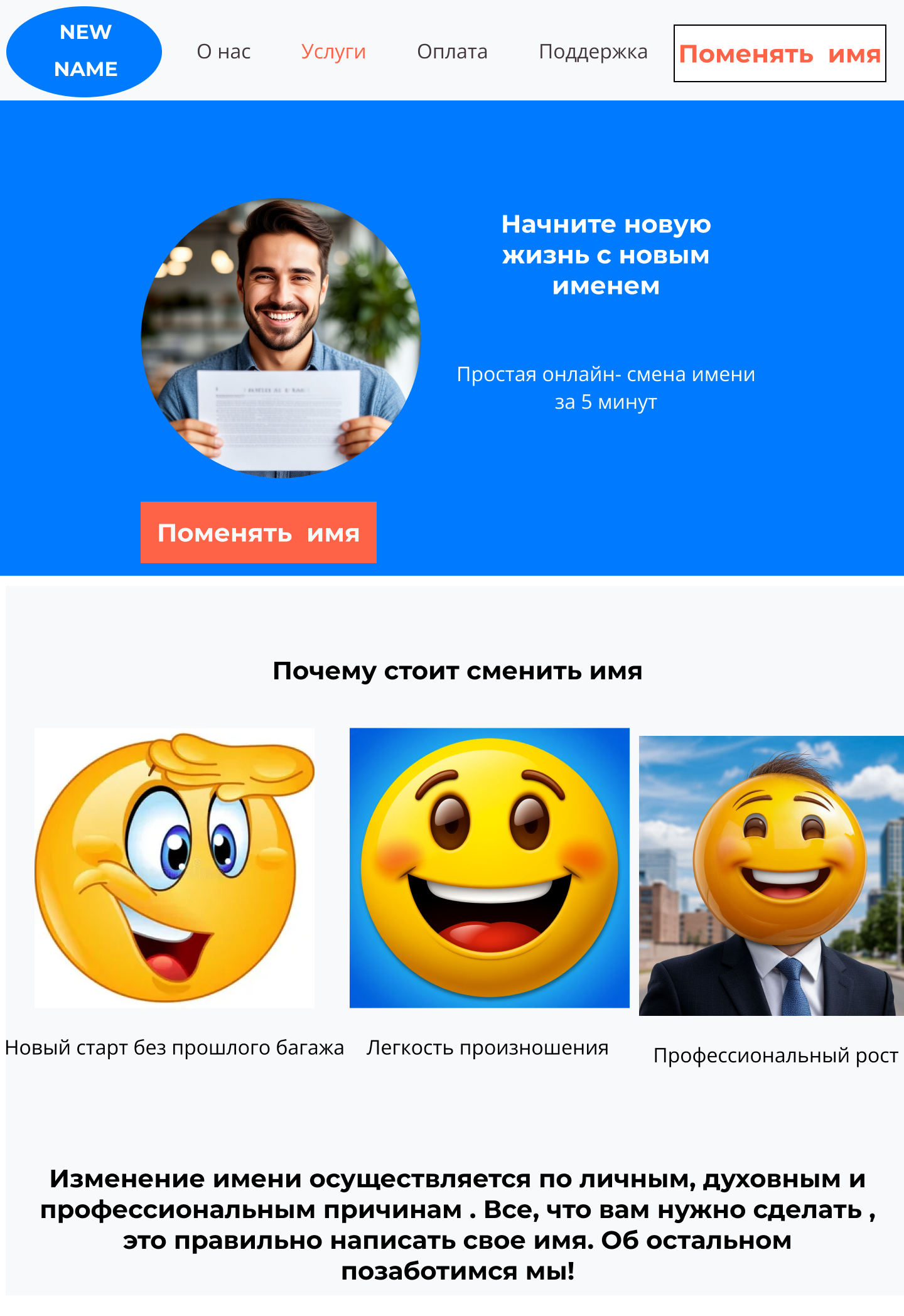 Создала сервис услуг по смене имени, заинтересовать пользователя новым именем. Современный удобный и понятный дизайн выполненный в Figma. Использовала мудборд